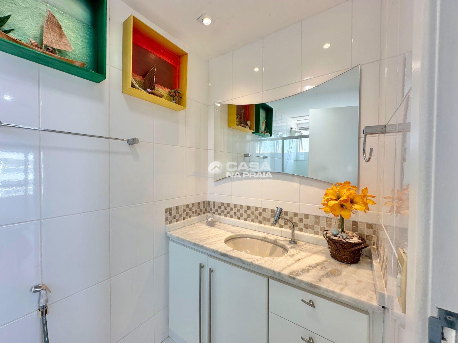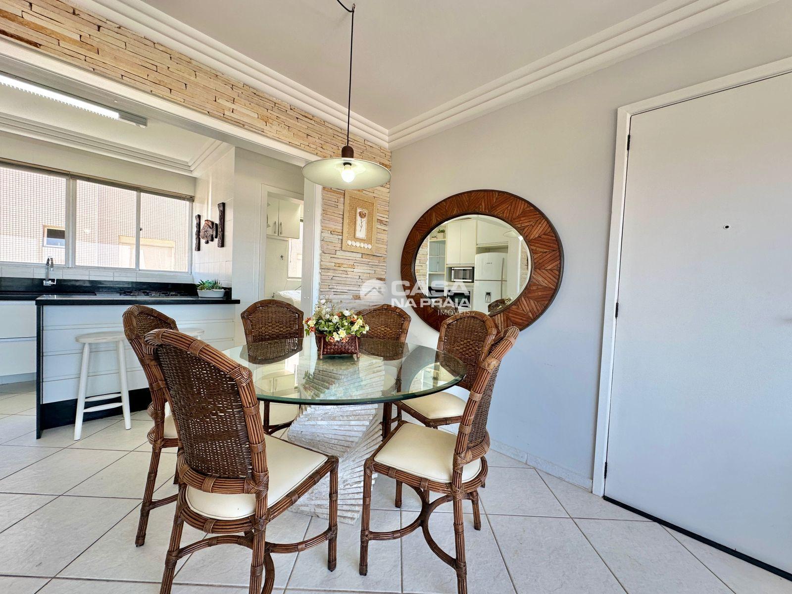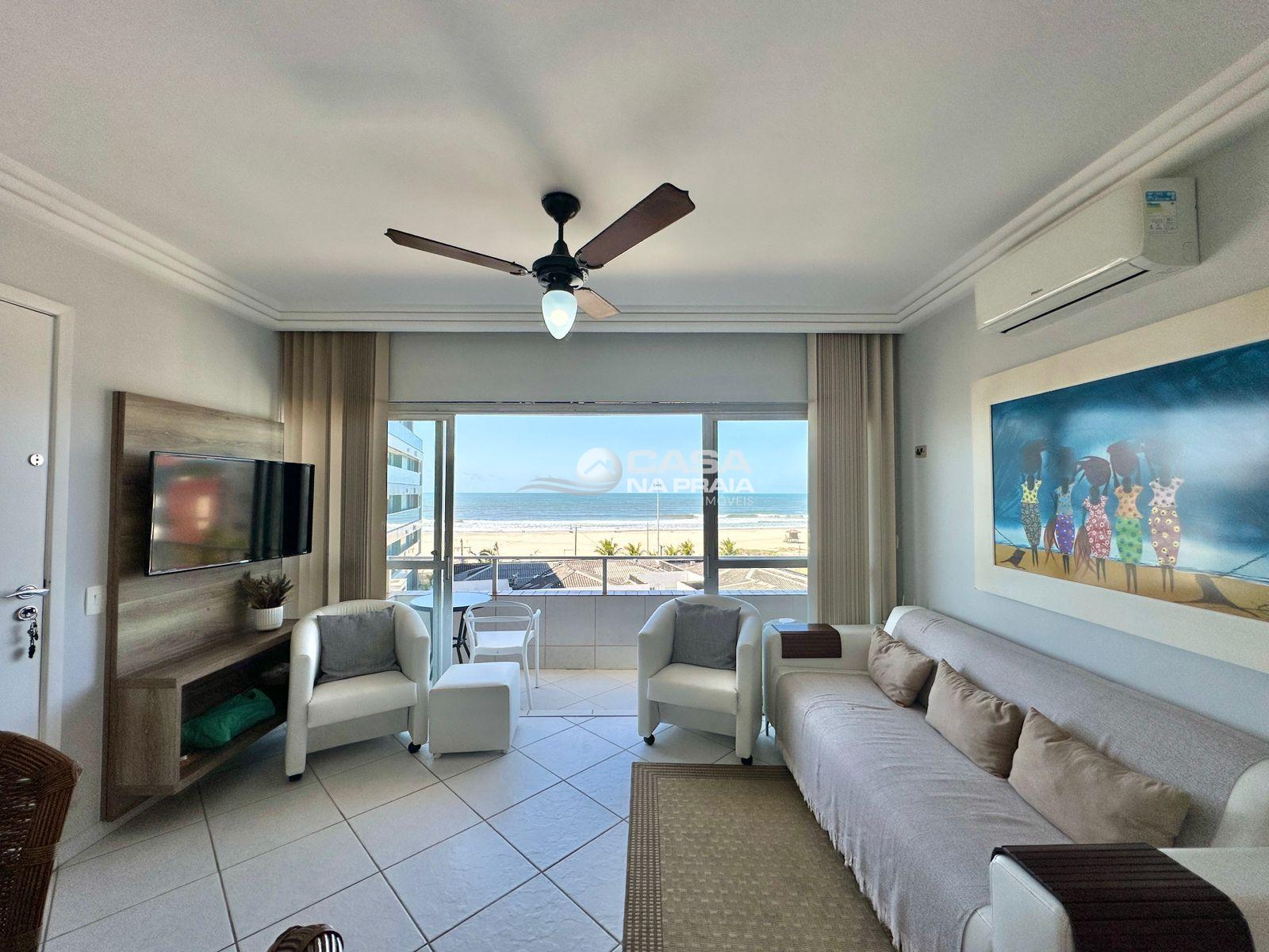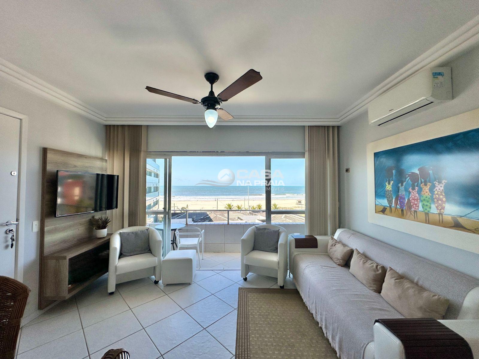 Possui 03 quartos (01 suíte), sala de estar e jantar integradas, sacada com vista para o mar, cozinha equipada, área de serviço e banheiro social. Conta ainda com Wi-Fi e 02 vagas de garagem.