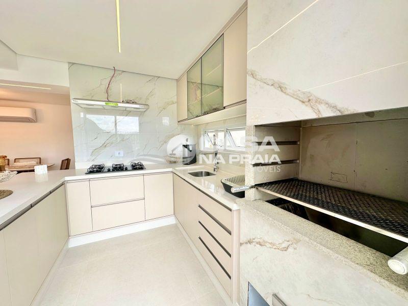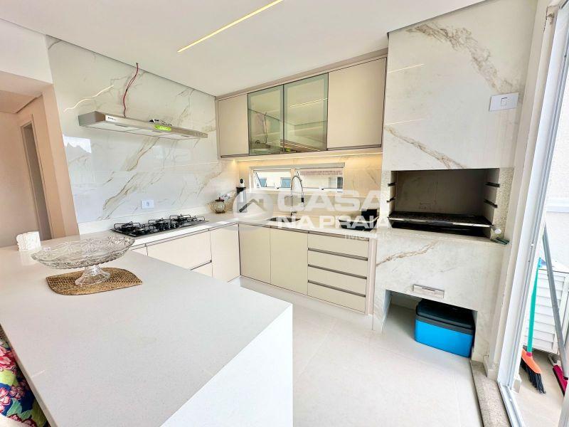 Sala de jantar integrada à cozinha com churrasqueira, banheiro, área de serviço e um amplo terraço, que dispõe de piscina privativa e ducha — perfeito para momentos de lazer e confraternização.